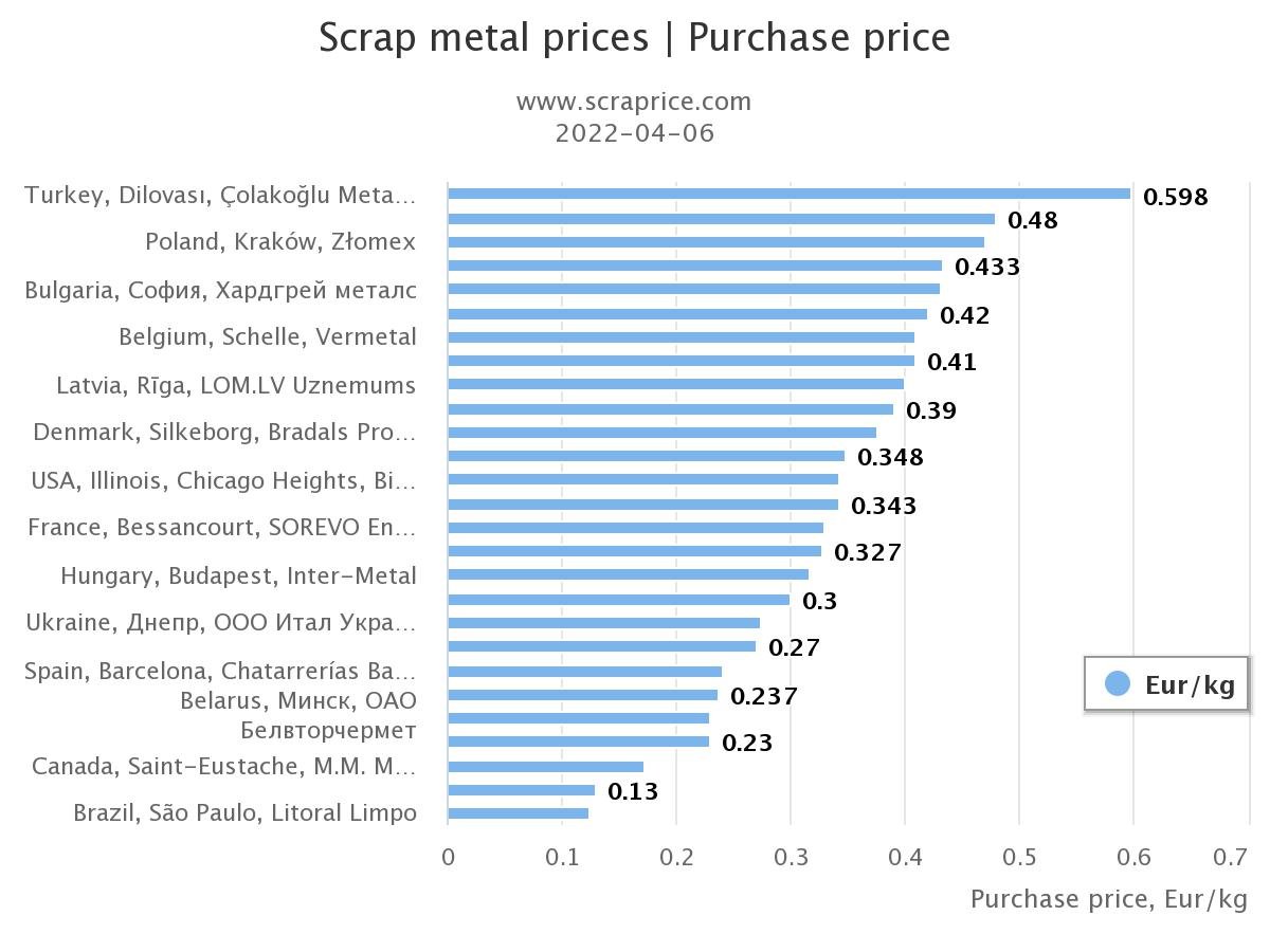 Od początku 2022 r. cena złomu wzrosła o 30% i w kwietniu osiągnęła rekordowy poziom. Cena złomu dziś (2022.04.06) osiągnęła 590 Eur/kg i więcej. Najwyższa cena złomu według portalu scraprice.com jest w Turcji. Logiczne byłoby stwierdzic, że przy takej wysokiej cenie złomu, zakłady metalowe drastycznie podniosą ceny swojej produkcji, a także wszystkie wyroby metalowe będą drożeć. W najbliższym czasie zobaczymy czy ceny skupu złomu będą dalej rosły, czy też osiągnęły już górną granicę i zaczną spadać. Kupcy złomu starają się nie trzymać dużych zapasów złomu w swoich magazynach, ponieważ ryzyko, że cena złomu zacznie wkrótce spadać,